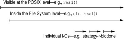 5.4. Causes of Read/Write File System LatencyThere are several causes of latency in the file system read/write data path. The simplest is that of latency incurred by waiting for physical I/O at the backend of the file system. File systems, however, rarely simply pass logical requests straight through to the backend, so latency can be incurred in several other ways. For example, one logical I/O event can be fractured into two physical I/O events, resulting in the latency penalty of two disk operations. Figure 5.3 shows the layers that could contribute latency. Figure 5.3. Layers for Observing File System I/O