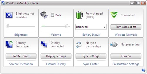| The Mobile PC Control Panel offers links to a fairly broad range of notebook features. A more targeted approach is found in the new Vista Windows Mobility Center, which you start by clicking the Mobility Center link in the Mobile PC Control Panel. Figure 7.2 shows the Windows Mobility Center window that appears. (Note that you see the full Mobility Center only in the Business, Enterprise, and Ultimate editions of Vista.) Figure 7.2. The new Mobility Center offers a selection of information and controls for notebook-related features. The Mobility Center offers information on eight key notebook areas, as well as controls to adjust these features: Brightness The current brightness setting of your notebook screen (if your machine supports this features). Use the slider to adjust the brightness. Volume The current notebook speaker volume. Use the slider to adjust the volume, or click Mute to toggle sound off and on. Battery Status The current charge level of the notebook battery. Use the drop-down list to select one of three power plans: Balanced, Power Saver, or High Performance or (I discuss these plans later; see "Power Management in Vista"). Wireless Network The wireless connection status (Connected or Disconnected), and the signal strength, if connected. Screen Orientation The current orientation of the Tablet PC screen. Click Rotate Screen to rotate the screen by 90° counterclockwise. External Display The current status of the external monitor connected to your notebook or docking station. Sync Center The current synchronization status of your offline files. Click the Sync button to synchronization your notebook's offline files. For more information, see "The Sync Center," in Chapter 8, "New Networking Features." Presentation Settings The current status of your presentation settings. Click Turn On to activate you presentation settings (see "Presentation Settings," later in this chapter). Note, too, that Microsoft is giving PC manufacturers access to the Mobility Center, so we'll likely see the Mobility Center window customized with features that are specific to particular notebooks. |