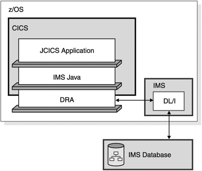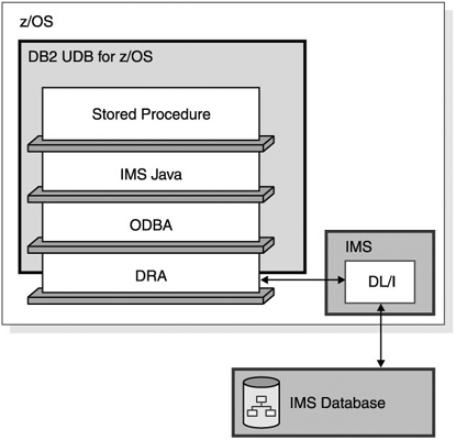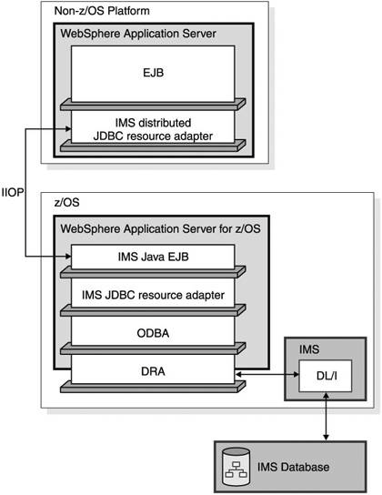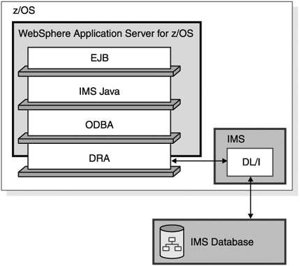 | The following sections briefly describe using Java application programs to access IMS databases from products other than IMS. Related Reading: For the details of the requirements for running Java applications from these products, see IMS Version 9: IMS Java Guide and Reference. WebSphere Application Server for z/OS ApplicationsYou can write applications that run on WebSphere Application Server for z/OS and access IMS databases when WebSphere Application Server for z/OS and IMS are on the same LPAR (logical partition). To deploy an application on WebSphere Application Server for z/OS, you must install the IMS JDBC resource adaptor (the IMS Java class libraries) on WebSphere Application Server for z/OS, and configure both IMS open database access (ODBA) and the database resource adapter (DRA). Figure 18-4 shows an Enterprise JavaBean (EJB) that is accessing IMS data. JDBC or IMS Java hierarchical interface calls are passed to the IMS Java layer, which converts the calls to DL/I calls. The IMS Java layer passes these calls to ODBA, which uses the DRA to access the DL/I region in IMS. Figure 18-4. WebSphere Application Server for z/OS EJB Using the IMS Java Function Remote Data Access with WebSphere Application Server ApplicationsWith the IMS Java function remote database services, you can develop and deploy applications that run on non-z/OS platforms and access IMS databases remotely. Unlike other Java solutions for IMS, you do not need to develop a z/OS application or access a legacy z/OS application to have access to IMS data. Therefore, the IMS Java function is an ideal solution for developing IMS applications in a WebSphere environment. Figure 18-5 shows the components that are required for an enterprise application (in this case, an EJB) on a non-z/OS platform to access IMS DB. Figure 18-5. The IMS Java Function and WebSphere Application Server Components DB2 UDB for z/OS Stored ProceduresYou can write DB2 UDB for z/OS Java stored procedures that access IMS databases. To deploy a Java stored procedure on DB2 UDB for z/OS, you must configure IMS Java, ODBA, and DRA. Figure 18-6 shows a DB2 UDB for z/OS stored procedure using IMS Java, ODBA, and DRA to access IMS databases. Figure 18-6. DB2 UDB for Z/OS Stored Procedure Using IMS Java CICS ApplicationsJava applications that run on CICS Transaction Server for z/OS can access IMS databases by using IMS Java. Java applications use the IMS Java class libraries to access IMS. Other than the IMS Java layer, access to IMS from a Java application is the same as for a non-Java application. Figure 18-7 on page 321 shows a JCICS application accessing an IMS database using ODBA and IMS Java. Figure 18-7. CICS Application Using IMS Java Related Reading: For information about configuring CICS for the IMS Java function and for information about developing a Java application that runs on CICS and accesses IMS databases, see IMS Version 9: IMS Java Guide and Reference. |