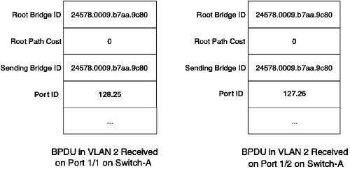 Switch-B decides if interface Gig0/2 is designated (Forwarding) for the segment attached by running the spanning-tree algorithm. Because the root bridge ID fields are the same, the next decision sequence is tested. This compares root path costs, with the lower root path cost winning. Switch-B sees that a switch (in this case the root bridge or Switch-A) has a lower cost (0 as compared to 19) to reach the root bridge, and hence, blocks interface Gig0/2, preventing a loop in the network. Now, examine the same process for VLAN 2 (an even VLAN). In this case, Switch-B is the root bridge, and hence, all ports on Switch-B are put into the Forwarding state. Switch-A needs to choose a root port and performs the same procedures as discussed for Switch-B in VLAN 1. Figure 4-17 shows the BPDUs that are compared when deciding the root port on Switch-A (assume the bridge ID of Switch-B in VLAN 2 is 24578.0009.b7aa.9c80). Figure 4-17. BPDUs (VLAN 2) Received on Switch-A Port 1/1 and Port 1/2
