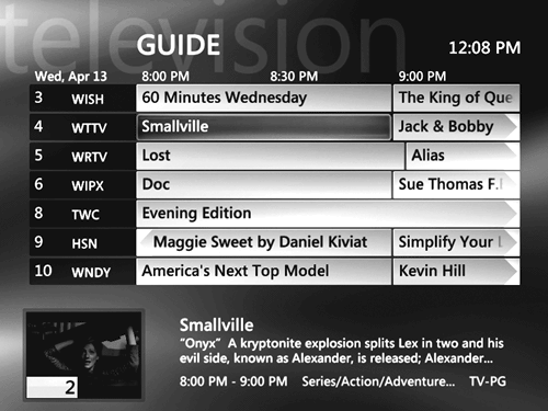 MANIPULATING PLAYBACK AND PAUSING LIVE PROGRAMMINGOne of the neat things about watching TV on a Media Center PC is the ability to pause live programming. When you press the Pause button on your remote control, the program you're watching goes to a freeze frame. The program, of course, continues to be received by your PC, but now it's directed to your hard disk for temporary storage. When you press the Play button on your remote, the program picks up where you left off as it was recorded on your hard disk. When you're watching programming that's been recorded to your hard disk, you can utilize Media Center's Rewind and Fast Forward options. These work as you'd expect, just like the Rewind and Fast Forward buttons on a VCR. There are a couple of new playback options, however, that you might get a kick out of. When you press the Replay button on your remote the program jumps back six seconds; this is great for catching a scene or a line you might have missed. (Press Replay a second time and you jump back another six seconds, and so on.) Even neater is the Skip feature; press the Skip button on your remote and jump ahead thirty seconds the precise length of most commercials. Which means, of course, that if you want to skip a commercial (and who doesn't?), all you have to do is press the Skip button. SWITCHING CHANNELS AND USING THE PROGRAM GUIDEYou can switch channels by using the Channel + and buttons on the remote control. You can also select programming from the Program Guide, which you display by selecting the Guide option onscreen. As you can see in Figure 17.5, the Program Guide displays 90 minutes' worth of programming for seven channels at a time. Click the right and left arrow buttons onscreen to view future and past time periods; click the up and down arrows onscreen to scroll through additional channels. Use your remote control's arrow keys to highlight a program, then press the OK button to change to that program. Figure 17.5. Use the Program Guide to select television programming; the currently selected channel continues to play in the lower-left corner of the screen.