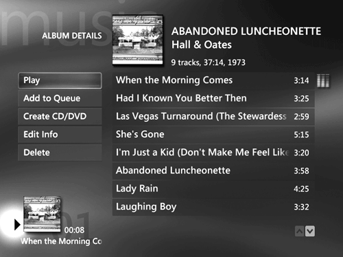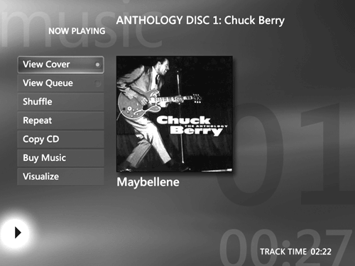 If you're a videophile, nothing but the Best quality will do. If you're comfortable with VHS-quality playback, experiment with the lower quality settings; Fair might be good enough for you! Playing MusicMedia Center presents a nice interface for playing both CDs and digital audio files. You can even use Media Center to rip CDs to your hard drive, and to burn new CDs. LISTENING TO CDSIf you're just playing a CD, you don't even have to open Media Center manually. Just insert the CD into your PC's CD-ROM drive, and Media Center automatically launches. The CD begins to play, and you're shown a Now Playing screen, like the one in Figure 17.6. By default, Media Center displays the album cover, but you can also choose to view a listing of all the tracks on the CD (select View Queue) or view a graphic visualization, like the ones you find in Windows Media Player (select Visualize). Figure 17.6. Playing a CD with Media Player.