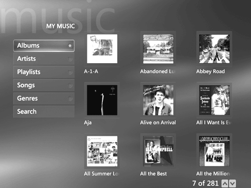 Normally, Media Center plays the tracks of the CD in proper order, but you can also choose to shuffle the playback of the CD's tracks (select Shuffle) or repeat the current track (select Repeat). And, if you're so inclined, you can also choose to buy more music from this artist online; select Buy Music and Internet Explorer launches, eventually taking you to a list of CDs and online retailers where you can buy them. Ripping the CD to your hard drive is as easy as clicking the Copy CD button. Media Center will automatically copy all the tracks of the CD, and (assuming you're connected to the Internet) download the album cover art for future display. LISTENING TO DIGITAL AUDIO FILESIt's almost as easy to listen to digital audio files stored on your PC's hard disk. From the main Media Center screen, select My Music. This displays the My Music screen, shown in Figure 17.7. From here you can choose to view your music collection in a number of different ways. Figure 17.7. Viewing your digital music collecton on the My Music screen.