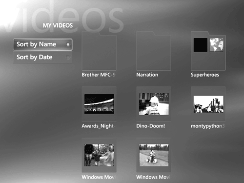 To burn a mix CD, you first have to create a queue of songs, as described in the Creating a Playlist section. Then you click the inset window to go to the Queue screen, click the Edit Queue button, and then click Create CD/DVD. Pretty easy. Viewing PicturesTIP One of the neat things about Media Center is that you can do two things at once. One of my favorite tricks is to start playing a CD or playlist in My Music, hit the green button to return to the main screen, and then start up a slideshow in My Pictures. The music continues to play as the slide show does its thing; a great way to relax with both pictures and music. Media Center also includes rudimentary picture-viewing capabilities. While you can't use Media Center to manage your stored photos, you can use it to view individual pictures, and to view pictures in a slide show format. When you select the My Pictures option on the Media Center main screen, you're taken to the My Pictures screen, shown in Figure 17.10. This screen displays all the pictures stored in your My Pictures folder, as well as any subfolders within that folder. (You can choose to sort these pictures by name or by date.) Use the arrow keys on your remote to highlight a particular picture, then press the OK button to enlarge that picture to full-screen. Figure 17.10. Viewing your digital photos on Media Center My Pictures screen.![]() To display your pictures as a slide show (five seconds per picture, by default), select the Play Slide Show option. To change the settings for the slide show, select the Settings options. Playing VideosIf you've used your computer to create any digital videos (using Windows Movie Maker, for example), you can play back those videos with Media Center. Just go to the main Media Center screen and select My Videos. All the videos in your My Videos folder will be displayed on the My Videos screen, as shown in Figure 17.11. Use the arrow keys on your remote to highlight the video you want to play; press the OK button to begin playback. Figure 17.11. Getting ready to play back digital videos via Media Center.