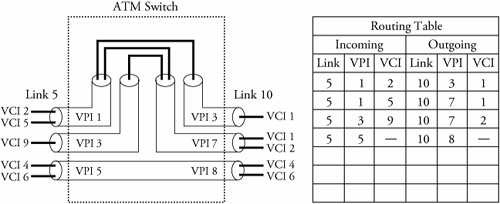 2.4. Equal- Sized Packets Model: ATMA networking model in which packets are of equal size can be constructed . Equalsized packets, or cells , bring a tremendous amount of simplicity in the networking hardware, since buffering, multiplexing, and switching of cells become extremely simple. However, a disadvantage of this kind of networking is the typically high overall ratio of header to data. This issue normally arises when the message size is large and the standard size of packets is small. As discussed in Section 1.3, the dominance of headers in a network can cause delay and congestion. Here, we describe Asynchronous Transfer Mode technology as an example of this model. The objective of Asynchronous Transfer Mode (ATM) technology is to provide a homogeneous backbone network in which all types of traffic are transported with the same small fixed-sized cells . One of the key advantages of ATM systems is flexible multiplexing to support multiple forms of data. ATM typically supports such bursty sources as FAX, coded video, and bulk data. Regardless of traffic types and the speed of sources, the traffic is converted into 53-byte ATM cells. Each cell has a 48-byte data payload and a 5-byte header. The header identifies the virtual channel to which the cell belongs. Similar to a telephone network, ATM is a set of connection-oriented protocols, which means that a connection must be preestablished between two systems in a network before any data can be transmitted. ATM is capable of supporting and integrating data, voice, and video over one transmission medium with high bit data rate delivery services into a single network. ATM is bandwidth-on-demand networking and is scalable in bandwidth with the ability to support real multimedia applications. The use of fixed-size cells can greatly reduce the overhead of processing ATM cells at the buffering and switching stages and hence increase the speed of routing, switching, and multiplexing functions. However, the great ratio of header to data makes the technology unsuitable for wide area networks and limits its applications in small networks. Like IPv6, ATM supports QoS mainly to reserve resources that guarantee specified maximum delay, minimum throughput, and maximum data loss. The QoS support allows ATM to concurrently handle all kinds of traffic. ATM connections are identified by a virtual channel identifier (VCI) and a virtual path identifier (VPI). VCI and VPI are combined to be used in a switch to route a cell. As shown in Figure 2.11, the identity of a "physical" link is identified by two "logical" links: virtual channel (VC) and virtual path (VP). When a connection is set up, the values of these identifiers remain unchanged for the lifetime of the ATM connection. Figure 2.11. Overview of a typical ATM transmission medium