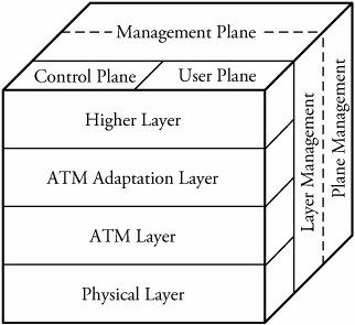 2.4.1. ATM Protocol StructureThe ATM protocol structure is shown in Figure 2.13. The three-dimensional model includes four layers in the vertical dimension. The tightly linked layers consist of the physical layer , the ATM layer , the ATM adaptation layer (AAL), and higher layers . The physical layer includes two sublayers : the physical medium and transmission convergence . The physical medium sublayer defines the physical and electrical/optical interfaces with the transmission media on both the transmitter and the receiver. This layer also provides timing information and line coding. The transmission convergence sublayer provides frame adaptation and frame generation/recovery. Figure 2.13. ATM protocol reference model The ATM layer provides services, including cell multiplexing and demultiplexing , generic flow control, header cell check generation and extraction, and most important, remapping of VPIs and VCIs. The AAL layer maps higher-layer service data units, which are fragmented into fixed-size cells to be delivered over the ATM interface. In addition, this layer collects and reassembles ATM cells into service data units for transporting to higher layers. The four types of AALs support different classes of services.