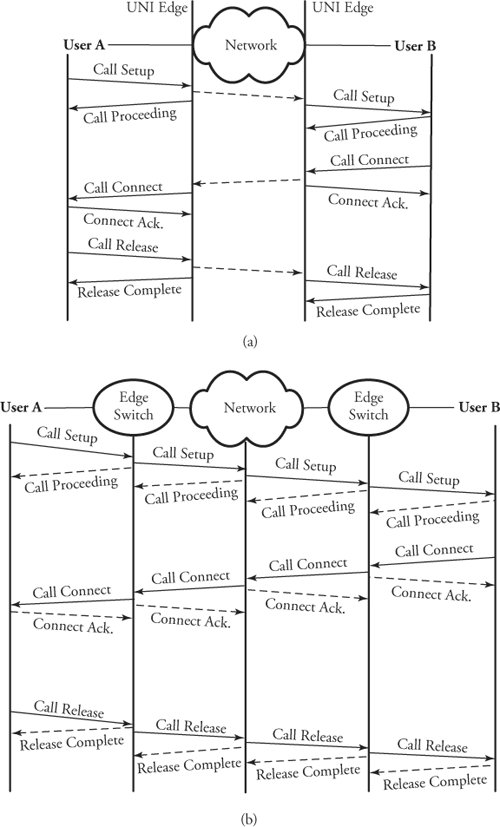The higher layers incorporate some of the functionality of layers 3 through 5 of the TCP/IP model. The control plane at the top of the cube shown in Figure 2.13 involves all kinds of network signaling and control. The user plane involves the transfer of user information, such as the flow-control and error-control mechanisms. The management plane provides management function and an information-exchange function between the user plane and the control plane . The management plane includes (1) plane management that performs management and coordination functions related to a system as a whole, and (2) the layer management that monitors bit error rates on a physical communications medium. An ATM network can support both a user-network interface (UNI) and a network-node interface (NNI). A UNI is an interface connection between a terminal and an ATM switch, whereas an NNI connects two ATM switches. A summary of these two interfaces is shown in Figure 2.14. If privately owned switches are in the network, the interface between the public and private parts of the network is called the public NNI, and the connection between two private switches is known as the private NNI (P-NNI). Figure 2.14. Overview of signaling: (a) UNI format; (b) NNI format 2.4.2. ATM Cell StructureAn ATM cell has two parts: a 48-byte payload and a 5-byte header, as shown in Figure 2.15. The choice of a 48-byte payload was a compromise among various design teams considering two important factors: packetization delay and transmission efficiency. (Refer back to Section 1.3 on packet size optimization.) The header consists of several fields. However, the ATM cell header has two different formats: UNI and NNI. The details of the UNI 5-byte header are as follows .