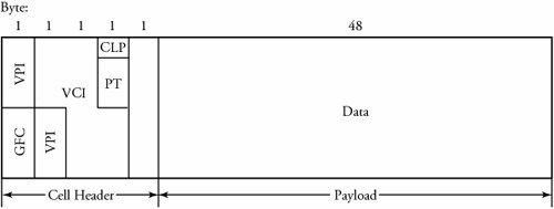 Figure 2.15. An ATM cell and its header structure The main difference between NNI and UNI formats is that the 4 bits used for the GFC field in the UNI cell header are added to the VPI field in the NNI cell header. Thus, for NNI, VPI is 12 bits, allowing for more VPs to be supported within the network. VCI is 16 bits for both cases of UNI and NNI. The values of VPI and VCI have local significance only with a transmission link. Each switching node maps an incoming VPI/VCI to an outgoing VPI/VCI, based on the connection setup or routing table, as shown in Figure 2.12. HEC works like other checking methods . First, the transmitter calculates the HEC field value, and the receiver side runs an algorithm consisting of two modes of operation. At initialization step, this field starts with an error-correction mode. If a single-bit error is detected in the header, the error-correction algorithm identifies the error bit and then corrects it. If a multibit error is detected , the mode moves to detection mode; errors are discarded but not corrected. Error-detection mode remains whenever cells are received in error, moving back to correction mode only when cells are received without error. |