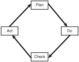 The Plan-Do-Check-Act CyclePMI identifies the Plan-Do-Check-Act (PDCA) cycle, also referred to as the Deming Cycle, as both a quality tool and the underlying concept for interaction among project management processes. First, an improvement is planned. Next, the improvement is carried out and measured. The results are checked and finally acted upon. Acting upon the improvement might mean making the improvement a standard, further modification to the improvement, or abandoning the improvement. Figure 4.2 demonstrates the PDCA cycle. Figure 4.2. The Plan-Do-Check-Act cycle. Quality Approaches and Project ManagementQuality approaches align with project management approaches in a number of areas, including achieving customer satisfaction, preventing defects instead of inspecting for them, management support for quality, and continuous improvement. Table 4.9 provides additional detail.
