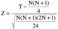 When you have a sample size larger than 25, you cannot use the Wilcoxon table. In such instances, your T is almost normally distributed. When this is the case, you proceed as before to find T. That is, you find the sum of the smaller ranks. After you find T, you use the following formula, which you evaluate based on the z table.