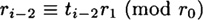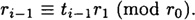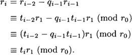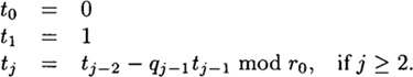 For 0 ≤ j ≤ m, we have that rj ≡ tjr1 (mod r0), where the qjs and rjs are defined as in the Euclidean algorithm, and the tjs are defined in the above recurrence.