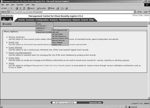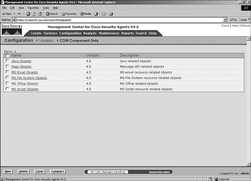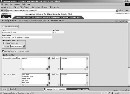 COM Component SetsCOM components sets are groups of COM program IDs and COM class IDs, which are typically referred to as PROGIDs and CLSIDs, respectively. When these are grouped into a COM component set, you can apply this new grouping to COM component access control rules to control access to COM objects matching this list. Like all the other sets discussed thus far, this type of set can also use wildcard pattern matching to create a more broad set of COM objects with fewer actual string definitions. To show the typical configuration of a COM component set, first look at the appropriate configuration page in the CSA MC. To get to the correct page, choose Configuration > Variables > COM Component Sets. This page provides a listing of all COM component sets currently available, as shown in Figure 5-27. Figure 5-27. COM Component Sets Page![]() Now that you have a list, choose the MS Office Objects set. Again, you see that this variable type is really no different in configuration from the other objects. At this point, you know that the only real difference between any of the variable types is related to the strings used for matching on that particular object and within what type of rule the particular set can be used. In this particular set, you can see the IDs you are matching listed one per line. Also note the wildcard pattern matching (*) used instead of listing every object possible. Figure 5-28 shows more detail. Figure 5-28. Example COM Component Set Configuration Page![]() To see how a COM object is used in a COM object access control rule, once again choose Show Reference List and link directly to a specific rule that is making use of this set. In Figure 5-29, you can see that this particular rule allows Microsoft Office applications (defined in an application class) to access the COM objects listed matched by the COM component set. Figure 5-29. Example COM Component Access Control Rule![]() NOTE Note that COM objects are a Microsoft-only feature. UNIX does not use COM objects. To assist in locating the COM object names that you will need to control access, every installation of CSA software includes a COM Object Extraction utility that enables you to view the COM objects available on the system in the Cisco\CSAgent\bin directory. The executable to run on the system is extract_com.exe. In Figure 5-30, you see what it looks like when you run the COM Object Extraction utility from a command line. The file created by the utility, which you can open in a text editor such as Notepad, shows you the output provided. Specifically, this portion of the text file shows both PROGIDs and CLSIDs. The PROGIDs are at the top of the screen, and the CLSIDs are at the bottom. Figure 5-30. COM Extraction Utility in Action![]() NOTE PROGIDs are typically listed as Excel.Application, whereas CLSIDs are listed in braces as uppercase hex values, such as {0000002F-0000-0000-C000-000000000046}. Registry SetsRegistry sets are groups of explicit or wildcard strings that match registry keys and hives. Many programs, including viruses and worms, place keys throughout the registry, which provide them with configuration information at the next execute time. Also if certain keys are placed in the correct location, the application auto-executes at system boot. Because the registry is a Microsoft-only concept, this set is available only to Windows agents. Be very careful when creating custom registry sets. If you inadvertently enter the wrong information to filter registry access, you could cause many issues with the function of the workstation or server. For this reason, always initially deploy registry access control rules in Test Mode. CAUTION Personally, I cannot think of a good reason not to deploy any new rule in Test Mode other than "I am under attack and my network is going up in flames," but maybe you have one. In any case, use the registry with caution. When matching a registry key(s), you must first understand the syntax allowed and the rules necessary: