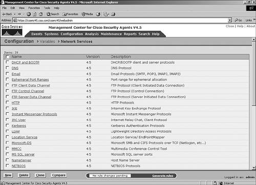 Figure 5-14. Application of a Network Address Set![]() The CSA MC includes several predefined network address sets, such as All IP Addresses, Authorized Port Scanners, External IP Addresses, and Internal IP Addresses. You can use these to ease deployment, but you might need to tune them to your specific enterprise IP deployment. Network Services SetsNetwork services sets are groups of specific IP services that you can apply to network access control rules. Creating a network services set enables you to define protocol-specific connection information such as initial ports and subsequent inbound or outbound connections the protocol may use. After defining the variable, you can refer to the set as the variable name (variable names always start with $) so that you do not have to list the ports separately in every rule. Instead of defining a new network services set, this section looks at the $HTTP set, which is a predefined set used in the preceding example: