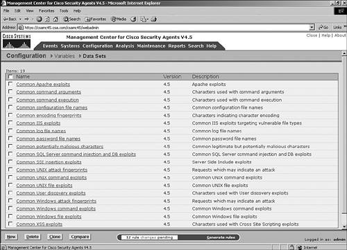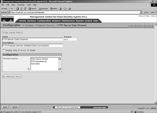 Some protocols use dynamically assigned source or destination port numbers as part of additional sessions. Some of these applications are related but not limited to file and video transfer on networks. To deal with temporary ports that need to be opened as a result of one of these connections, you can use ephemeral ports in your protocol definition of CSA rules. To use ephemeral ports, use either TCP/ephemeral or UDP/ephemeral, depending on your specific needs. (See Figure 5-17.) Figure 5-17. Ephemeral Ports in a Network Services Set![]() NOTE Because some protocols create additional connections or sessions as part of the protocol specification, you should specify these additional connections in other network services sets and apply them to rules as needed. You can use the network services variables anywhere you would use specific ports, such as in network access control rules. The use of these variables is not mandatory but will greatly ease your administration. Data SetsData sets are variables that you can use as data access control rules. These sets are sets of strings that you can group together. Their only purpose is to be matched against the Uniform Resource Identifier (URI) in HTTP requests. You can use several data sets that come preconfigured in the CSA MC to match sets of meta characters. Meta characters are known classes of attacks and web server-specific exploits. Follow these steps to configure a sample data set: