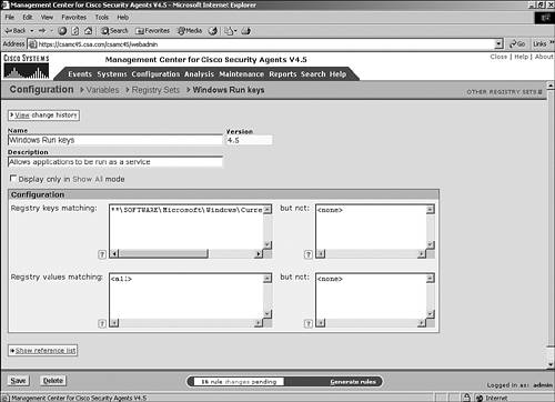 In Figure 5-31, you can see an example registry set configuration. Here you can that this example is going to match using wildcards **\SOFTWARE\Microsoft\Windows\CurrentVersion\Run*\*. This string will match any of the Run or RunOnce keys in the registry. When applied to a registry rule, you can deny the ability of applications to write to these keys. This would prevent many malware applications from installing themselves to auto-execute at boot. Figure 5-31. Registry Set Configuration Example![]() |