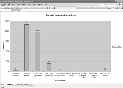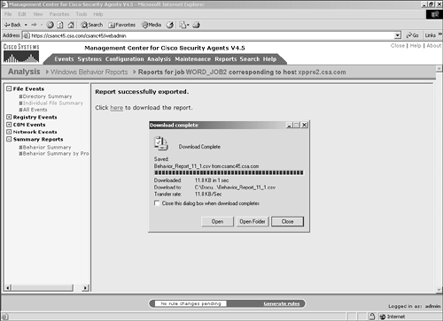 | The behavior investigation provides a great deal of useful information to the security team and offers helpful filtering and sorting capabilities; however, the reports provided by the CSA MC interface might not provide the data in a view you require. If you want to export the report to another application, just open the page of data you want to export and click the Export This Report link located just below the last section in the left navigation pane. Clicking this link bundles the report for retrieval to your system via the onscreen link provided, as displayed in Figure 11-22. Figure 11-22. Downloading Exported Report Data![]() To download the CSV (comma-separated values) report to your local system, right-click the link provided and save the data to an appropriate location. From here, you can easily import the data into a number of applications such as a database or spreadsheet. Figure 11-23 demonstrates what an imported CSV file looks like in Microsoft Excel, and Figure 11-24 shows a sample graph you can create from the data. Figure 11-23. Imported Data in Excel![]() Figure 11-24. Graph Created from the Imported Data![]() |