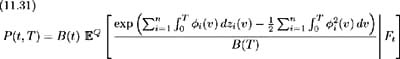 The bond price in (11.27) is not an explicit function of the market prices of risk, these enter only via the short-term interest rate process r ( t ). Hence the formulae for the bond and relative bond prices (11.27) and (11.28) remain unchanged once the market prices of risk have been eliminated, except that the Brownian motion no longer depends on the specific n bond maturities chosen, that is