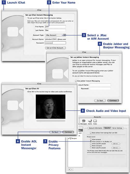 The first step in using iChat is to set up your iChat account , an identification that's necessary for you to use iChat. Either your .Mac member name or a pre-existing AIM screen name qualifies as an iChat account ID. iChat supports both .Mac accounts and AIM screen names ; if you already have an AIM namefor example, if you're an AOL user or if you used AIM previouslyyou can continue to use that as your identification in iChat, and you won't have to create a new identity when you first start iChat. If you have a .Mac account, however, you might want to use it for your identification in iChat, as it stores more information about you than an AIM identification does. You can add all your AIM buddies to your iChat Buddy List just as they appear in AIM.