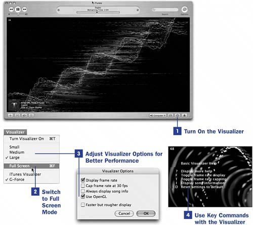 38. Use the iTunes Visualizer BEFORE YOU BEGIN 33 Find and Play Music SEE ALSO 76 Add a Third-Party Visualizer The idea certainly wasn't pioneered by iTunes, but it's where the art has really matured: the Visualizer , a program within iTunes that shows colorful graphical shapes swimming across the screen that jerk and jiggle and dance in response to the music that's playing, gives your music a whole new dimension in which you can enjoy it. NOTE The Visualizer built into iTunes is based on G-Force by SoundSpectrum. G-Force itself has continued to develop independently and can be added to iTunes as a third-party visualizer. See 76 Add a Third-Party Visualizer for more information. It's difficult to describe what the Visualizer doesit's easier just to see it demonstrated. Fortunately, this is no more complex a task than clicking a button. KEY TERM Visualizer A program within iTunes that displays colorful patterns in a window or the full screen. The Visualizer responds visually to the playing music by creating agitated wave shapes in many different constantly changing forms. | 1. | Turn On the Visualizer As you're playing your music (or while it's stopped ), click the Visualizer button in the lower-right corner of the iTunes' window or choose Visualizer, Turn Visualizer On . The contents of the entire iTunes' window are replaced by the swirling, colorful shapes of the Visualizer, shifting and reforming in response to the music. NOTE The Visualizer responds to the waveform of the audio signal while music is playing by creating agitated wave shapes, and traces out smooth shapes when the music is paused . The amplitude of the wave shapes you see doesn't depend on the volume level of iTunes and won't get more spectacular if you crank the sound up all the way. | | 2. | Switch to Full Screen Mode To get the full psychedelic effect of the Visualizer, you really should run it in Full Screen mode ( especially if you have a large monitor). Choose Visualizer, Full Screen , then turn on the Visualizer; the screen fades out and is replaced by the full- size Visualizer mode. Now you can turn off the lights and let your current playlist carry you away. | When the Full Screen option is enabled in the Visualizer menu, the computer switches to the Full Screen Visualizer mode whenever you invoke it; the Visualizer button in the lower-right corner of the iTunes window shows the Visualizer icon within a "TV screen" to indicate that it's in this mode. Choose Visualizer, Full Screen again to disable Full Screen mode and ensure that turning on the Visualizer won't take over your whole screen. | To exit the Full Screen Visualizer and return to your music listing, press Esc . Alternatively, press Ctrl+F (in Windows) or " +F (on the Mac) to switch out of Full Screen mode but keep the Visualizer running within the iTunes' window. | | 3. | Adjust Visualizer Options for Better Performance The Visualizer is a fairly processor- intensive feature, and the smoothness of its appearance depends a lot on how fast your computer is. If it looks choppy to you, there are a few things you can do to improve it. 38. Use the iTunes Visualizer First, try choosing Medium or Small from the Visualizer menu; these options shrink the image area of the Visualizer within the iTunes' window, reducing the amount of work the computer has to do. If this doesn't help, or you don't like the smaller appearance, try reducing the resolution but not the size. Click the Options button in the upper-right corner of the iTunes window. In the dialog box that appears, enable the Faster but rougher display check box. The visual performance of the Visualizer should be greatly enhanced by this option, although the individual shapes look blockier. Also, on the Mac, make sure that the Use OpenGL option is selected if your computer has a video card capable of OpenGL instructions. TIP The iTunes Visualizer can be a handy way to benchmark your computer's performance. Enable the Display frame rate option to see how many frames per second the Visualizer can draw, reflected in the upper-left corner of the display window. At 50 to 60 frames per secondfaster than the human eye can effectively discernyour computer's pretty muscular indeed. | | 4. | Use Key Commands with the Visualizer For experts who really want to tweak their Visualizer experience, there are a number of keyboard commands available within the Visualizer. Press ? while the Visualizer is running to see a list of basic key commands; press ? again to see the second page of commands. Among the available commands are R to start a new visual style (or "config") at random, C to show the name of the current config, through 9 to choose from among 10 popular configs , and I to show the current song information and album art. There are also key commands to turn on and off the frame rate display ( F ) and rate capping at 30 frames per second ( T ). | |