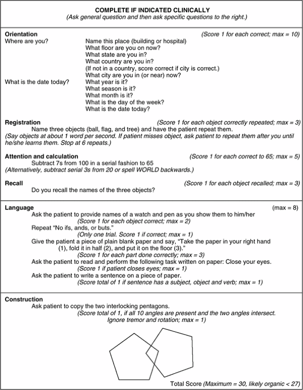 Formal cognitive screens can quantify impairments and point to the need for further evaluation. The Mini-Mental State Examination produces a numerical score with up to 30 points given for correct answers to questions (likely organic < 27 points) (Figure 25-1). Specific cognitive assessment must be performed, since many patients are able to cover a deficit in routine conversation.