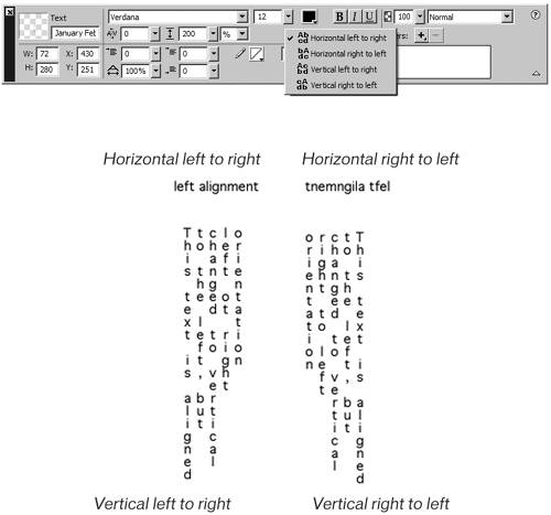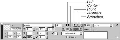 | You can change the alignment of your text relative to the text box. Click one of the alignment buttons on the Property inspector to change the alignment. To fit text within a set space, you can set the alignment to stretch the text. To indent the first line of a paragraph, enter the amount of indentation in pixels in the Indent First line text box. You can also change the text orientation. The default is horizontal left to right. |