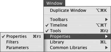 Figure 1.48. To access the Properties tab of the Property inspector, choose Window > Properties; from the submenu, select the tab you want to be active in the panel.  Flash opens the Property inspector with the Properties tab active. The panel displays information about whatever item you have selected in the Flash document (see "The Power of the Property Inspector)."