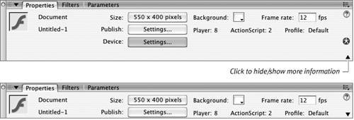 | By default, Flash 8 creates a tabbed panel-group known as the Property inspector. In Flash Basic the panel-group has two tabs: the Properties tab displays information about the properties and attributes of tools and graphic elements (such as color, style, and font for the text tool); the Parameters tab displays information about components (see Chapter 12). In Flash Professional, the panel has a third tab: Filters, which allows you to add special effects to text and certain symbols (to learn about symbols, see Chapter 7). You can use any of the techniques in the preceding exercises to change the grouping of the Property inspector's panels. For now, leave them in the default panel-group, even though you'll work mostly with just the Properties tab. The Properties tab of the Property inspector is context-sensitive, changing to reflect the tool or element you have selected. You'll learn about specific versions and tabs of the Property inspector in later chapters. For now, just learn the general rules of operation. To access the Properties tab of the Property inspector - Choose Window > Properties > Properties, or press
