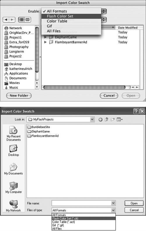 Figure 2.16. To reload a saved set of colors, in the Import Color Swatch dialog, choose Flash Color Set from the Enable menu (Mac, top) or Files of Type menu (Windows, bottom). | 2. | To determine what types of files to display, from the Enable pop-up menu (Mac) or Files of Type (Windows) pop-up menu, choose one of the following: