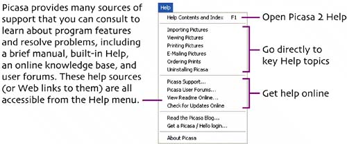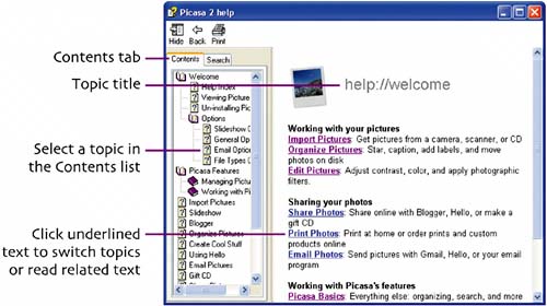 To open Picasa 2 Help, choose Help > Help Contents and Index, press , or choose a specific topic from the Help menu. You can also click a button in a Picasa dialog box or another part of the interface. To view Help topics on the Contents tab, refer to the figure below.