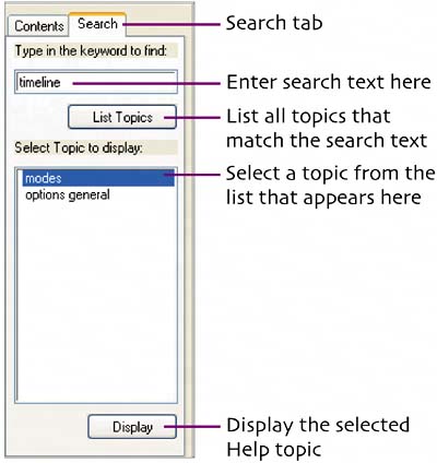 Enter search text in the box and then click the List Topics button. Relevant topics appear in a list below.