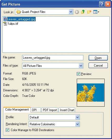 The Color Manage to RGB Destinations option is checked because we checked it in the Quark CMS Preferences. The Get Picture dialog box lets you disable this command on a per-image basis, but we want to leave it checked.