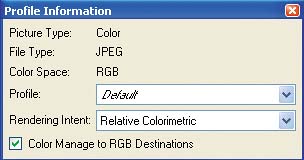 The Profile drop-down menu identifies the profile for the selected image. In this case, Default is selected, because the image does not contain an embedded profile, and Quark has assigned the default profile we selected in the Quark CMS Preferences dialog box. You can change the source profile for the image, as well as the rendering intent, if you need to.