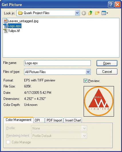 Notice that the entire Color Management area of the dialog box is dimmed, and that the Profile drop-down menu reads None. QuarkXPress supports source color spaces only for images, not for vector artwork, including EPS files. EPS files should have a source profile embedded in them when they're saved from Adobe Illustrator (see Chapter 7). When it comes time to print, Quark CMS will convert the EPS file from the source color space to the destination space set by the embedded profile.