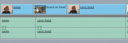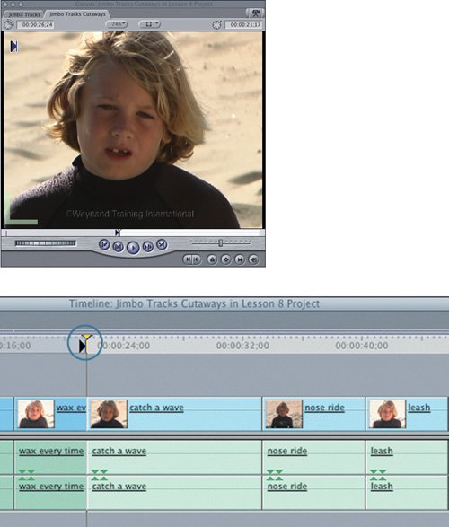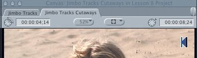 | In the Jimbo Tracks sequence you just created, the sound track begins to tell a story. But you also need pictures to complete the job, and the current combination of Jimbo clips is not pleasing. When a clip jumps from one person to the same person in a similar camera framing, in this case a medium close-up, it's called a jump cut. In this exercise, you will cover some of the Jimbo video with other video shots that help tell the story, while keeping the sound track intact. These other shots are referred to as cutaways because you literally cut away to something else. Sometimes cut-away material is referred to as B-Roll footage. To edit video clips or cutaways over existing material, you will need to mark edit points directly in the Timeline to identify just the portion of material you want to replace or overwrite. Marking in the Timeline uses all the same shortcuts as marking in the Viewer, but the mark buttons for the Timeline appear in the Canvas window.  Editing with One Timeline Edit Point For this exercise, you will set In and Out points in the Viewer to determine what portion of the cutaway clip you want to see. You will also mark an In point in the Timeline where you want to place the cutaway. Actually, this will give you the same result as parking the playhead where you want the edit to be placed. 1. | In the Browser, locate the Jimbo Tracks sequence. Ctrl-click it and choose Duplicate from the shortcut menu. Name it Jimbo Tracks Cutaways and double-click to open it.