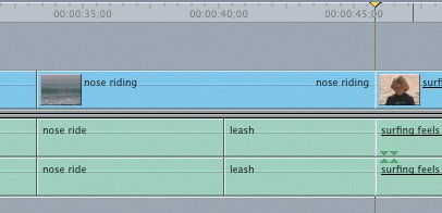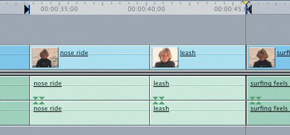 | Backtiming a Clip There are occasions when the last frame you want to use of a source clip is more important than the first. In this case, you mark In and Out points in the Timeline to create the edit placement and duration, and mark an Out point in the Viewer on what you want to be the last frame of the clip. Final Cut Express aligns the source clip's Out point to the Out point in the Timeline and uses whatever portion of the clip it needs to fill the distance back to the Timeline In point. This is referred to in editing as backtiming a clip. You are literally backing it into an edit slot. 1. | In the Timeline, park the playhead on the first frame of the nose ride clip, and mark an In point.
