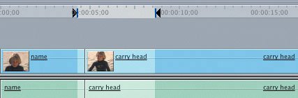 | Editing with Two Timeline Edit Points An alternate method is to make two edit points in the Timeline and one in the Viewer. You mark an In and an Out point in the Timeline to identify the clip placement and length. When you do this, you only need to mark an In point on the source clip in the Viewer to identify where you will start using the clip. The source clip will automatically stop at the Out point in the Timeline. 1. | In the Timeline, play from the beginning of the sequence and mark an In point just after Jimbo says "... since I was 5 years old." This time press the I key to mark an In point.