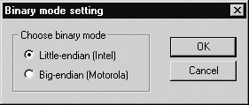 One of the problems with viewing files in hex viewers is the notion of Least Significant Byte Code (little endian) versus Most Significant Byte Code (big endian), which come into play when files of one type of architecture (such as Motorola processors) are viewed on another (such as Intel processors). Frhed can compensate for this difference by using the switches in the menu you access by choosing Options | Binary Mode. In this way, files from a different byte-ordered machine can be analyzed and swapped easily with this tool. The following illustration shows the Binary Mode Setting dialog box, which you access by choosing Options | Binary Mode.
