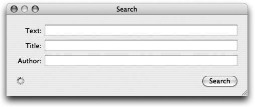 This completes our use of Interface Builder, so we save our work and switch to Xcode. Find the SearchTidBITS.applescript file in the Xcode project window and open it. Templates for the event handlers that we specified in Interface Builder have already been created: on will open theObject (*Add your script here.*) end will open on launched theObject (*Add your script here.*) end launched on choose menu item theObject (*Add your script here.*) end choose menu item on clicked theObject (*Add your script here.*) end clicked on double clicked theObject (*Add your script here.*) end double clicked on should close theObject (*Add your script here.*) end should close Now we'll write our script's code, filling in these event handlers and adding any further user handlers of our own. Let's tour the final code a little at a time. In Example 27-1 we declare some top-level globals. We also write code for the launched handler that will be called right after the application has started up; this is the best place for general initializations, which is just what we use it for here, locating the Perl file within our application's bundle and retaining its POSIX pathname as a global. Example 27-1. Globals and launched handlerglobal perlScriptPath, L1, L2, textSought, titleSought, authorSought on launched theObject local f set f to (path to resource "parseHTML.pl") set perlScriptPath to quoted form of (POSIX path of f) end launched Example 27-2 shows the will open handler. Observe that these event handlers have a parameter, theObject; this contains a reference to the interface element with which this action message, notification, or delegation query is associated. In this case, we know that only the Search window is set to deliver a will open notification, so there is no need to bother checking theObject's identity; we just blithely assume that it's the Search window. Example 27-2. The will open handleron will open theObject tell theObject call method "setDisplayedWhenStopped:" of progress indicator 1 with parameter 0 end tell end will open The code illustrates the use of call method to form a manual bridge from AppleScript to Objective-C. We want to make sure that the progress indicator is invisible when not spinning. This setting is available through a built-in Cocoa method, but no AppleScript property is bridged to it, so we cross the bridge ourselves; in effect, we form the equivalent of the following line of Objective-C code: [theProgressIndicator setDisplayedWhenStopped: NO]; Example 27-3 shows the choose menu item event handler, which is the action message from the Search Example 27-3. The choose menu item handleron choose menu item theObject hide window "results" tell window "search" tell matrix 1 set content of cell 1 to "" set content of cell 2 to "" set content of cell 3 to "" call method "selectTextAtIndex:" of it with parameter 0 end tell show end tell end choose menu item Example 27-4 shows the clicked handler. This is the Search button's action message, and is the heart of our application. To make the code clearer, I've broken the functionality out into some ancillary user handlers. We start by initializing our globals based on what's in the Search window form; then, after a sanity check, we call the next user handler, doTheSearch. Example 27-4. The clicked handler and an associated utilityon clicked theObject tell matrix 1 of window "search" set textSought to my urlEncode(content of cell 1) set titleSought to my urlEncode(content of cell 2) set authorSought to my urlEncode(content of cell 3) end tell if length of textSought < 5 and length of titleSought < 5 and Example 27-5 is a utility hander, feedbackBusy, purely for manipulating the interface to provide some user feedback. We're going to be talking to the Internet by way of curl, and while we're doing this, nothing will be happening. The user might think that the application is idle or broken. Therefore we spin the progress indicator and disable the Search button to give the user a sense that the application is busy and that he should keep his hands off while it does whatever it's doing. The handler is called with a boolean parameter telling whether to begin or end this feedback. Once again there's a use of call method to make up for a deficiency in the bridging: here, we force the window to update its display so that the disabled or enabled Search button will look disabled or enabled. Example 27-5. The feedbackBusy handleron feedbackBusy(yn) tell window "search" if yn then set enabled of button 1 to false start progress indicator 1 else set enabled of button 1 to true stop progress indicator 1 end if call method "display" of it end tell end feedbackBusy Example 27-6 shows the doTheSearch handler. This should seem familiar, being nearly unchanged from the code in Chapter 25. The main differences are: