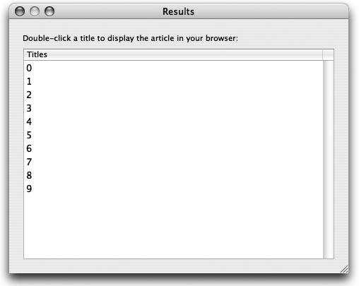 27.2.3. AppleScript Studio ExampleAs a tutorial example, let's return to the code presented earlier for searching the TidBITS online archive (in Chapter 25). Recall what it does. We allow the user to enter search terms. We use curl to submit those terms to the TidBITS search engine. The reply is a page of HTML listing the pages found. We use Perl to parse the HTML, and present the results to the user as a list. If the user double-clicks a listed article, we present the corresponding page in the web browser. The purpose of the tutorial is to illustrate AppleScript Studio development by wrapping this script in a nice interface. We'll have two windows, a Search window where the user enters search terms and a Results window where the results will be listed. Begin by creating the project. Start up Xcode. Choose File We must embed the Perl script into the bundle of the built application. This must be done by the build process, so the Perl script must be incorporated into the project. Select the Resources folder on the left side of the project window and choose Project Now we'll design the interface. In the project window, double-click MainMenu.nib. Interface Builder will open. I'm going to skip some details ("drag this interface element from this palette onto this window, resize it, make these settings in the Attributes pane of the Inspector," and so forth) and simply show you the interface design we're going to construct. It consists of two windows and some changes to the menu bar: