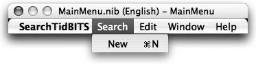 Now comes the really interesting part. As you'll recall, the Cocoa framework defines certain action messages, lifetime notifications, and delegation queries that can be sent to your code. In Interface Builder, we must specify which of these messages we want to receive, with respect to each element of our interface as well as the application as a whole. (Remember, we must elect to receive some of these messages or our code will never run.) At the same time, we should also give at least some of our interface elements AppleScript names, so that our AppleScript code can refer to them. All of this is done in the AppleScript pane of the Inspector window. Figure 27-2. Results window![]() Figure 27-3. The menu bar![]() Figure 27-4 shows the process. I've selected the Search window (not shown) and now I focus my attention on the Inspector and its AppleScript pane. In the Name field I've entered an AppleScript name, "search"; this will allow our code to refer to this window by name, as window "search". In the list of event handlers , I've checked the "will open" checkbox; this means that our code will receive a will open event at the appropriate moment in the lifetime of this window (namely, when it is about to open). Somewhat confusingly, it is not sufficient to check this checkbox; it is also necessary to check the Script checkbox specifying the file SearchTidBITS.applescript, so that AppleScript Studio knows what script to send the will open event to (even though our project has in fact only one script). Figure 27-4. AppleScript Inspector for the Search window![]() Here are the interface items of our project and the treatment I apply to each: