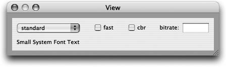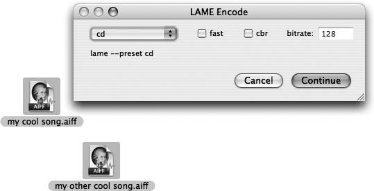 Example 27-6. The doTheSearch handleron doTheSearch( ) local d, f, r set d to "'-response=TBSearch.lasso&-token.srch=TBAdv" set d to d & "&Article+HTML=" & textSought set d to d & "&Article+Author=" & authorSought set d to d & "&Article+Title=" & titleSought set d to d & "&-operator" set d to d & "=eq&RawIssueNum=&-operator=equals&ArticleDate" set d to d & "=&-sortField=ArticleDate&-sortOrder=descending" set d to d & "&-maxRecords=2000&-nothing=MSExplorerHack&-nothing" set d to d & "=Start+Search' " set u to "http://db.tidbits.com/TBSrchAdv.lasso" set f to (POSIX path of (path to temporary items)) & "tempTidBITS" feedbackBusy(true) try do shell script If the doTheSearch handler doesn't error out, it calls displayResults to populate the Results window and present it to the user. Example 27-7 shows the displayResults handler, along with two event handlers connected with the Results window. The double clicked event handler responds when the user double-clicks a line of the table of article titles: the corresponding URL is sent to the web browser for display. The should close handler works around a bug in Tiger's version of AppleScript Studio (at least I think it's a bug): a window that might be shown again later must not be closed, as if it is shown again later it will malfunction. Therefore when the user attempts to close the Results window we prevent it (by returning false) and hide the window instead; it looks to the user as if the window has closed, but it hasn't. Example 27-7. The displayResults handleron displayResults( ) tell table view 1 of scroll view 1 of window "results" set contents to L2 end tell show window "results" end displayResults on double clicked theObject try open location (item (clicked row of theObject) of L1) end try end double clicked on should close theObject hide theObject return false end should close This completes the development of our application. To test it, choose Build Figure 27-5. SearchTidBITS in action![]() 27.2.4. Automator ActionsAn Automator action (see "Automator" in Chapter 2) is an excellent way to wrap some AppleScript code with a lightweight interface. An Automator action is not a standalone application; rather, it is hosted by Automator (or by some other environment that can run Automator workflows). An action typically has no windows or menus; rather, a single pane (technically, an NSView) appears as the action's interface within Automator, and optionally can appear when the workflow runs, as a way of supplying the script with parameters. This isn't much interface, but in many cases it will be just enough. The script also receives as a parameter the output values from the previous action in the workflow. An Automator action thus gives the end user more power and flexibility than a pure script: the end user can position the action within a larger workflow, and can set options in its interface, effectively repurposing the script and customizing its behavior without seeing or editing its code (and without having to know any AppleScript). To write an Automator action is not difficult, and takes only a few minutes; and it can be done using AppleScript Studio. Here's a hands-on tutorial illustrating the process of writing an Automator action. (See /Developer/ADC Reference Library/documentation/AppleApplications/Conceptual/AutomatorConcepts for Apple's full documentation.) For our example, we'll write an action that accepts file aliases and encodes those files as MP3s using lame (http://lame.sourceforge.net). It is assumed that lame is installed in its default location, which is /usr/local/bin. In our action's interface, we'll provide an option for selecting a preset and a bitrate. MP3 encoding is a time-consuming activity, so our implementation will script the Terminal (rather than calling do shell script) so the user can see some feedback as the encoding proceeds. Start up Xcode. Choose File Now let's create our action's interface. In the project window, double-click main.nib to start up Interface Builder. The View window displays the pane in which the Action's interface is to appear. Start by removing the placeholder text ("UI elements go here"). Apple's interface guidelines for Automator actions specify that interface elements should be Small size rather than Regular, and that the NSView should have 10-pixel margins. They also suggest using space economically, and in particular they ask that a popup menu should be preferred to radio buttons. Figure 27-6 shows our action's interface. The top row contains the interface elements the user can set. The popup menu contains the names of the most important presets: its items are "insane," "extreme," "standard," "medium," a menu item separator, then "studio," "cd," "hifi," "tape," and "mw-us." The second row contains a text field that we'll use to show the user the results of the current settings in the top row. We won't implement VBR bitrates, so the bitrate text field will be disabled unless the "cbr" checkbox is checked. The height of the NSView has been reduced as much as possible; vertical space is at a premium when the user is constructing a workflow in Automator, so we don't want to waste any. Figure 27-6. The action's interface![]() Just as in the AppleScript Studio tutorial, earlier in this chapter, we now give our interface elements AppleScript names and arrange for notification when the user changes one of them. The names are namePopup, fastSwitch, cbrSwitch, cbrText, and example. The notifications must all be sent to ui.applescript; they are the popup menu's action, the clicked of the two checkboxes, and the bitrate text field's action and changed, along with the NSView's update parameters and awake from nib. We can use Cocoa bindings to tie our interface items to parameter values that our main.applescript code will receive. That's why the NSObjectController called "Parameters" is present in the main window. The use of bindings isn't compulsory, but in this case we can save ourselves a bit of