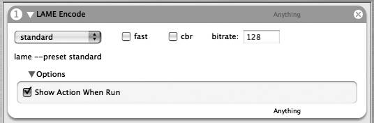 Also, in the General collection, check "Can show when run" at the bottom of the window. Observe the use of the Parameters settings to supply part of our interface with initial values by way of the bound keys; so, for example, the bitrate field will initially contain "128" because we say so here. It is crucial that the name and spelling for the keys, such as cbrText, should match exactly between Interface Builder (where the interface item is bound to that key) and here (where the key's initial value is given). You should be wondering what the exampleText parameter is for, as we have no interface element bound to this key. This parameter is part of a trick that will be used later to communicate between our ui.applescript and main.applescript files, so read on and all will be made clear. So much for the info window, but unfortunately we still need to edit Info.plist a bit further by hand. Select Info.plist in the project window and choose File We are now ready, at long last, to write our code. Start with ui.applescript. Remember, the purpose of this script is to interact with our action's interface. The code is almost identical to what we'd put in a standalone application built with AppleScript Studio. I'll present the code a bit at a time. Example 27-8 shows start of the code. The very first thing is to capture a reference to the NSView that contains the interface elements so that the rest of our code can refer to them. (Unlike our earlier standalone application example, we have no globally available named window, such as window "search", on which to base a reference to an interface element.) We have set the NSView to send us an awake from nib notification; this notification is guaranteed to arrive very early when our action's interface loads, and since theObject in this case in the NSView itself, we simply copy it to a property. To this and all the other action messages and notifications, we respond by calling our updateInterface handler; thus our interface will be "live," updating itself whenever the user does anything. Example 27-8. Keeping the interface updatedproperty theView : missing value on awake from nib theObject set theView to theObject updateInterface( ) end awake from nib on action theObject updateInterface( ) end action on clicked theObject updateInterface( ) end clicked on changed theObject updateInterface( ) end changed Example 27-9 shows the updateInterface handler. The idea is to construct the lame command based on what the user has selected and typed in the interface, displaying this command in the example text field in the action's interface. To keep things simple, I have omitted to perform certain validations; in particular, the user can enter anything in the bitrate text field. (If the value is an unreasonable number, we use it anyway, and if it's not a number, we treat it as 128.) Example 27-9. Constructing the lame command on updateInterface( ) tell theView set s to title of popup button 1 set s1 to "lame --preset " if (state of button "fastSwitch") is 1 then if state of button "cbrSwitch" is 0 then if s is in {"medium", "standard", "extreme"} then set s1 to s1 & "fast " end if end if end if if (state of button "cbrSwitch") is 1 then try set s to "cbr " & (content of text field "cbrText" as integer) on error set s to "cbr 128" end try end if set content of text field "example" to s1 & s end tell end updateInterfaceNow comes the clever part (Example 27-10). We want main.applescript to receive, among its parameters, the updated value of the example text field, as this is the lame command to be sent along to the Terminal. These parameters are supplied as a record whose items are based on the parameters listed in Info.plist. That's why we created the exampleText parameter in Info.plistto make it appear in the parameters record. In addition, we have implemented the update parameters event handler, whose purpose is exactly to give us a chance to modify the values in the parameters record. This event handler will be called just before the workflow runs; the record containing the parameters arrives under the name theParameters. So we update the interface one last time, and then we modify the exampleText item of theParameters and hand back the modified record. Example 27-10. Passing a parameter to main.applescripton update parameters theObject parameters theParameters updateInterface( ) set |exampleText| of theParameters to (content of text field "example" of theView) return theParameters end update parameters Now we are ready for main.applescript (Example 27-11). This script contains just one event handler, the run handler , which has been created for us. It takes two parameters: input, which is the output from the previous step in the workflow, and parameters, which contains the bound values from the interface along with the modifications made in our update parameters handler. We assume that input is a list of aliases; we convert these aliases to POSIX pathnames. We extract the exampleText item from the parameters record; this is the lame command the user wants us to perform. Now we form a shell command that will loop through each POSIX pathname in turn and hand it to our lame command. (The shell is assumed to be bash.) We send this shell command to the Terminal for execution. The Terminal will execute this command asynchronously (we have specified that are ignoring application responses), so our handler will end immediately; we must return something to serve as our action's output, even though the action produces no meaningful output, so on the principle of doing least harm we return the same list we received as input. Example 27-11. The action's main script on run {input, parameters} set myInput to (input as list) set L to {} repeat with anAlias in input set end of L to quoted form of POSIX path of anAlias end repeat set text item delimiters to space set theFiles to L as string set s to "arr=(" & theFiles & "); " set s to s & "for i in \"${arr[@]}\"; " set s to s & "do 