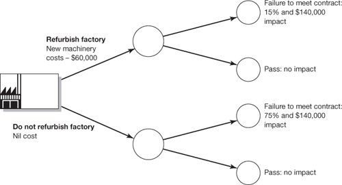 This type of analysis is commonly used in decision tree analysis (see below). A positive EMV is an opportunity value, but a risk is expressed as a negative EMV. Monte Carlo analysisThis type of analysis uses the network diagram and estimates to conduct a series of simulations on cost and schedule for the project. It is able to evaluate the overall risk in the project and provides a percentage value that it will be finished by a certain date, or within a specified cost. The simulation can also be used to determine the probability of any activity being on the critical path and to take path convergence into account. The series of complex iterations is normally conducted using a computer-based Monte Carlo program, with the results displayed in a probability distribution form. Decision treeDecision trees are used to make decisions about individual risks when there is an element of uncertainty. A decision tree tries to take future events into account when making a decision today. If you are unsure about any decisions, this technique could be used to assist the decision-making process by considering all the implications of each choice. Solving the decision tree provides the EMV for each alternative when all the benefits and subsequent decisions are quantified. As an example, Company X is considering whether to refurbish an old factory, or to continue running on its existing facility due to the launch of a new product. Figure 11.5 shows the calculated impacts when determining whether the plant works or fails for the production of the new item. It shows that if the refurbishment costs are looked at in isolation, the decision to spend money on the old plant would seem unwise. However, taking just one future event into account, the decision to refurbish the old factory to produce the new item could work out cheaper. Figure 11.5. Decision tree for a factory refurbishment
