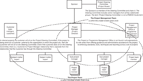 Figure 2.4. A representative organizational structure of a projectThere are many different names for the titles or roles of those in the project who come under the Project Manager. The three main types are shown here. Sub-project managers have management responsibility for a part of the project. Subject matter experts may or may not perform project work, but their primary contribution to the projects is their specialized expertise remember that the Project Manager is not expected to know about all areas of the project, their role is to do project management, so subject matter experts provide the expertise necessary to design and plan the project and to make sound and informed decisions on their subject matter. Project team member is the term for anyone else on the project. It is useful to have a term for the group who collectively do project management in the project, and this is the project management team. The project team means everyone involved in doing project work, although normally the Customer, Sponsor and Steering Committee are excluded from both these groups as they are not involved in doing day-to-day project work. Where there is a Project or Programme Management Office, it may or may not be involved in project management or project execution, which is why in this diagram the PMO box is partly included in the broken-lined circles. On large projects or where the individual has negotiated a title increase, the Project Manager may be called Project Director.
