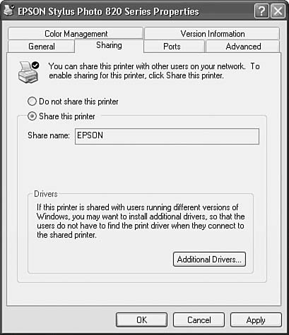 To ensure that the printer has been properly configured for sharing on the network, use another computer on the network to connect to the printer share and print a document. In addition to the Sharing tab on the printer's properties sheets, you will find other tabs, depending on the type of printer you have configured on the system. For example, a Color Management tab would be present for a color printer but not for a monochrome laser printer. You might want to check out all of these tabs that are created for your printer to determine whether there are other features you might want to configure. |