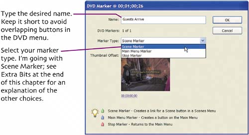 | Scene markers allow your viewers to jump directly to marked scenes. For example, I'll insert markers at the start of the movie, when guests start arriving, when the clown starts performing and the year in review slide show, among other scenes, so my viewers and I can quickly access them. Think about scenes in your movie you want viewers to be able to directly jump to and work with me. |