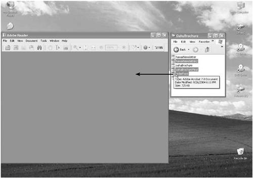 Opening Files via Drag and DropYou can also open documents by dragging one or more PDF files onto the Reader application window, the application icon, an alias of the application icon, or the program icon positioned in the Status Bar (Windows) or Dock (Macintosh). Double-clicking a PDF document also opens it in the Document pane. If Reader is not currently open, all these actions will launch the Reader program and then open the file in the Document pane. To open either a single file or multiple files using drag and drop methods: