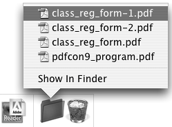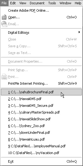 Viewing Recent FilesAs files are opened, Adobe Reader keeps track of the most recently viewed files in the File menu. In Windows, the list appears at the bottom of the File menu; on the Macintosh it's found in a submenu called Open Recent File. By default, the number of files appearing in a recently viewed list is five. You can change that number through a preferences setting. Open the Preferences dialog (Ctrl/Command+K). Click Startup in the left pane and type a value in the text box adjacent to Maximum documents in most-recently used list. Reader accepts values from 1 to 10 in the text box. Click OK after editing the value, and the list displays the number of recently viewed files you set in the Startup preferences. To open a recently viewed file, click File and select a filename at the bottom of the menu (Windows shown in Figure 4.4) or select Open Recent File (Macintosh shown in Figure 4.5). When you select the filename, the file opens in the Document pane. Figure 4.4. Click File and select a file to open from the list at the bottom of the menu.