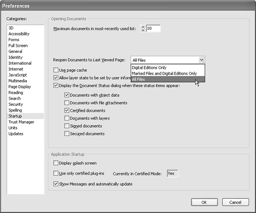 This feature is particularly helpful when you're reading downloaded Digital Editions (eBooks). When you start reading a book and eventually quit Reader, you can later pick up where you left off without having to navigate the document, just as if you'd left a bookmark in a physical book. You have three options when reopening PDF files. Select All Files to reopen all files you view in Adobe Reader to the last viewed page. This option is helpful if you tend to review long documents and you want to be able to review a given document over the course of several Adobe Reader sessions. Each time you open a document, it opens on the last viewed page. Choose the option Marked Files and Digital Editions Only when you want to open only Digital Editions. Marked files are Digital Editions you subscribe to and can choose to mark as accepted or refused. Choose Digital Editions Only to apply this setting to eBooks and Digital Editions only, excluding the marked files.