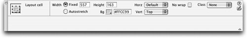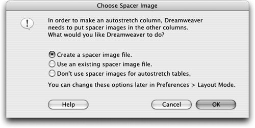 Note The Choose Spacer Image dialog box includes an option to create a spacer image file. If you are working on a site for which there is no existing spacer image, you should choose this option and click OK to navigate to the directory in which you want Dreamweaver to save the spacer image. The Images folder is the best place. The Autostretch column is displayed in the table widths bar as a zigzag lineyou might have to scroll down to the bottom of the document to see it. Dreamweaver inserts spacer images to control the layout of the fixed-width columns when you select Autostretch. A spacer image controls the spacing in the layout, but is not visible in the browser window.
